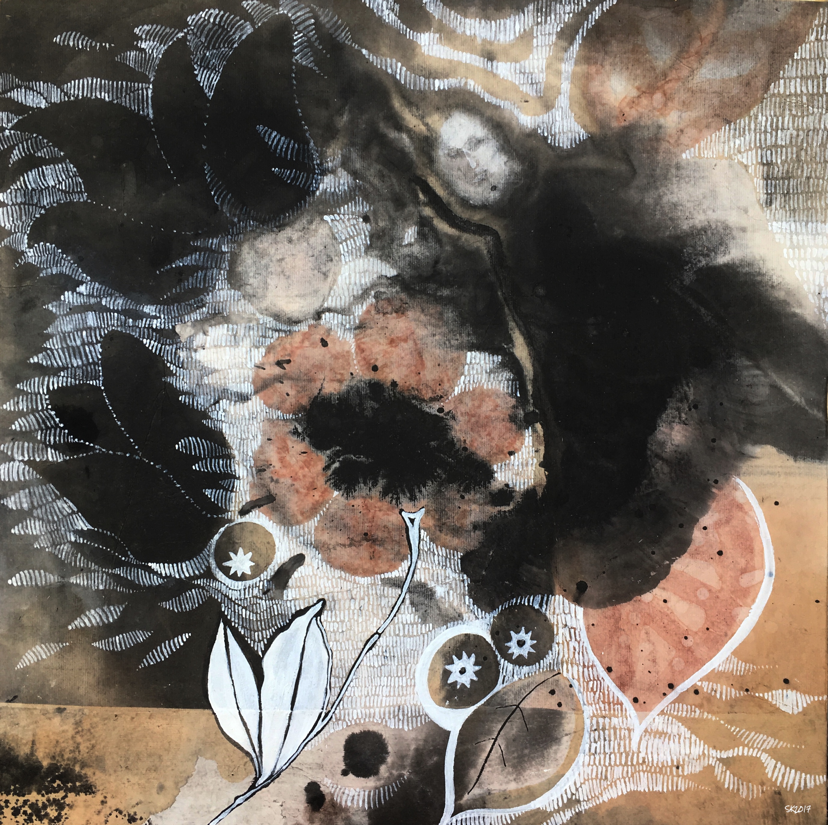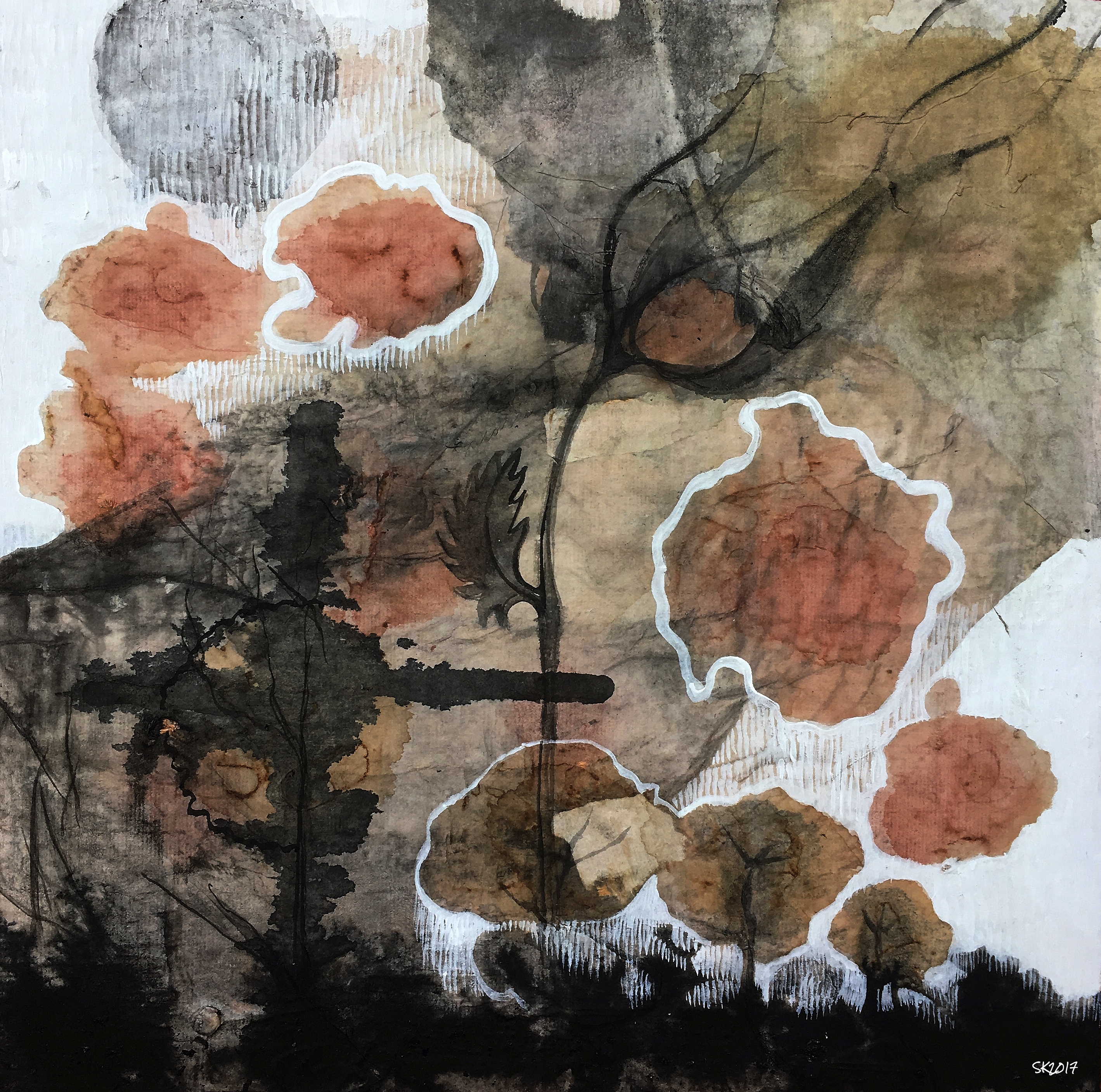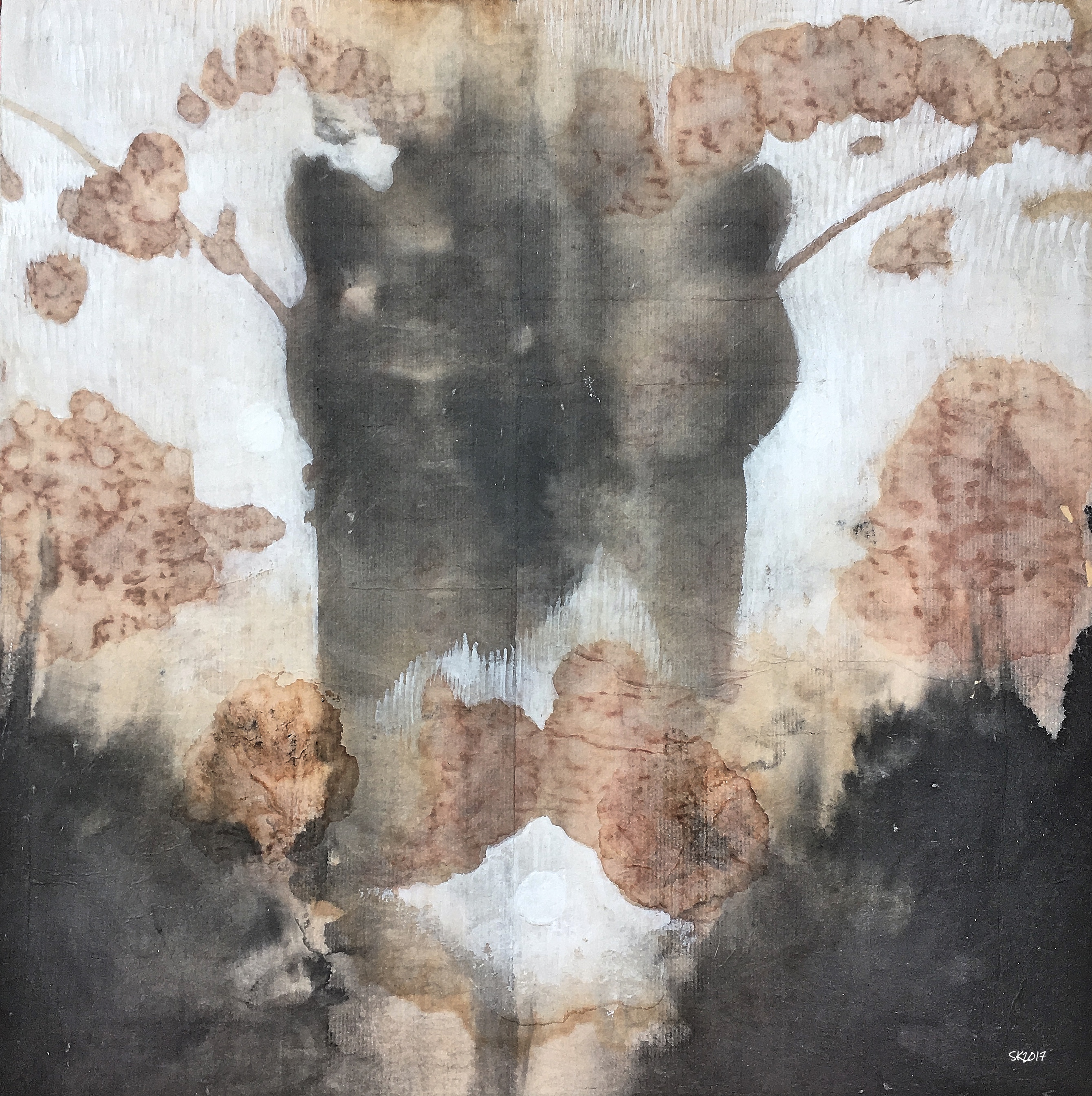 Red wine, coffee, Sumi ink and acrylic on rice paper and wood 2017