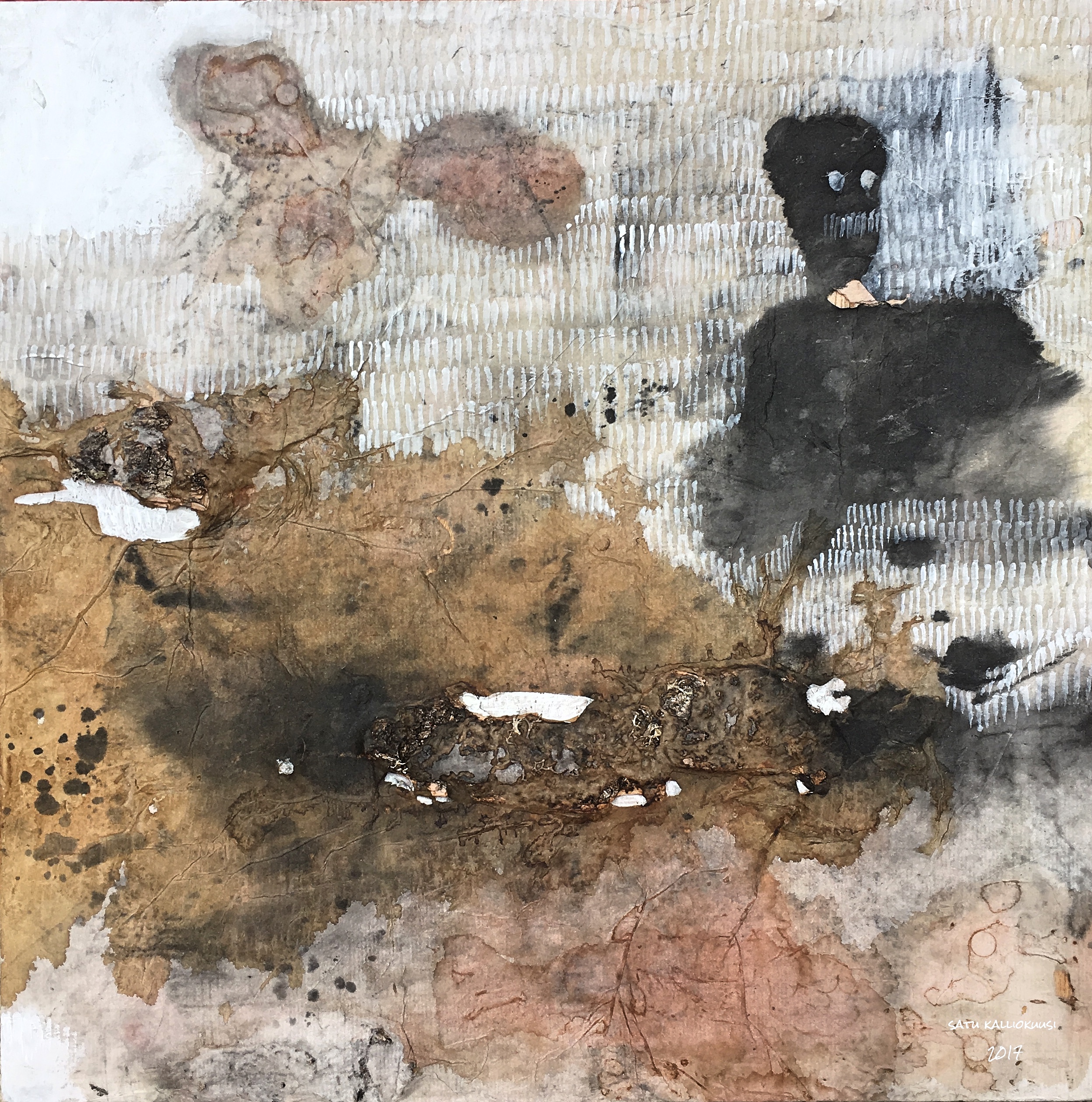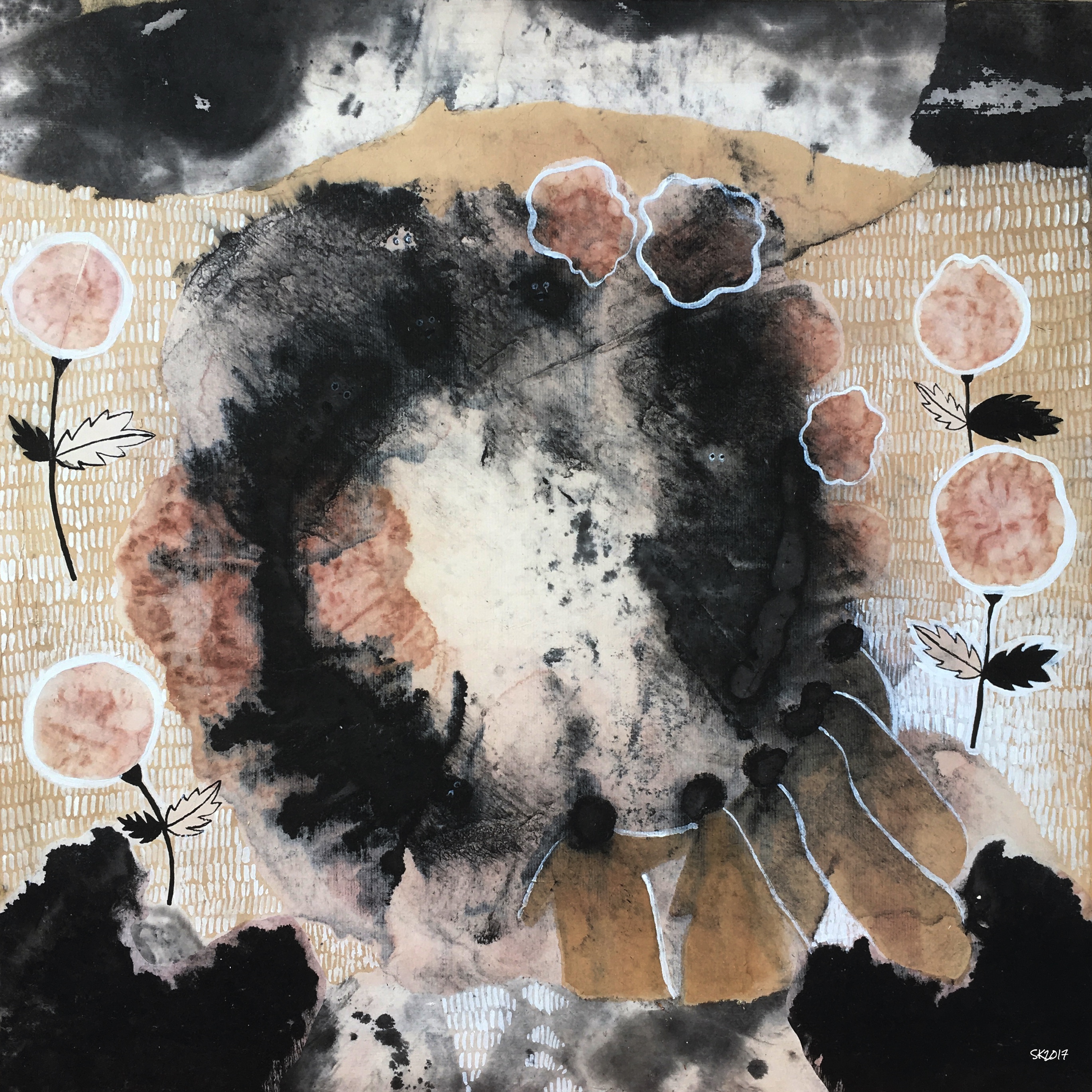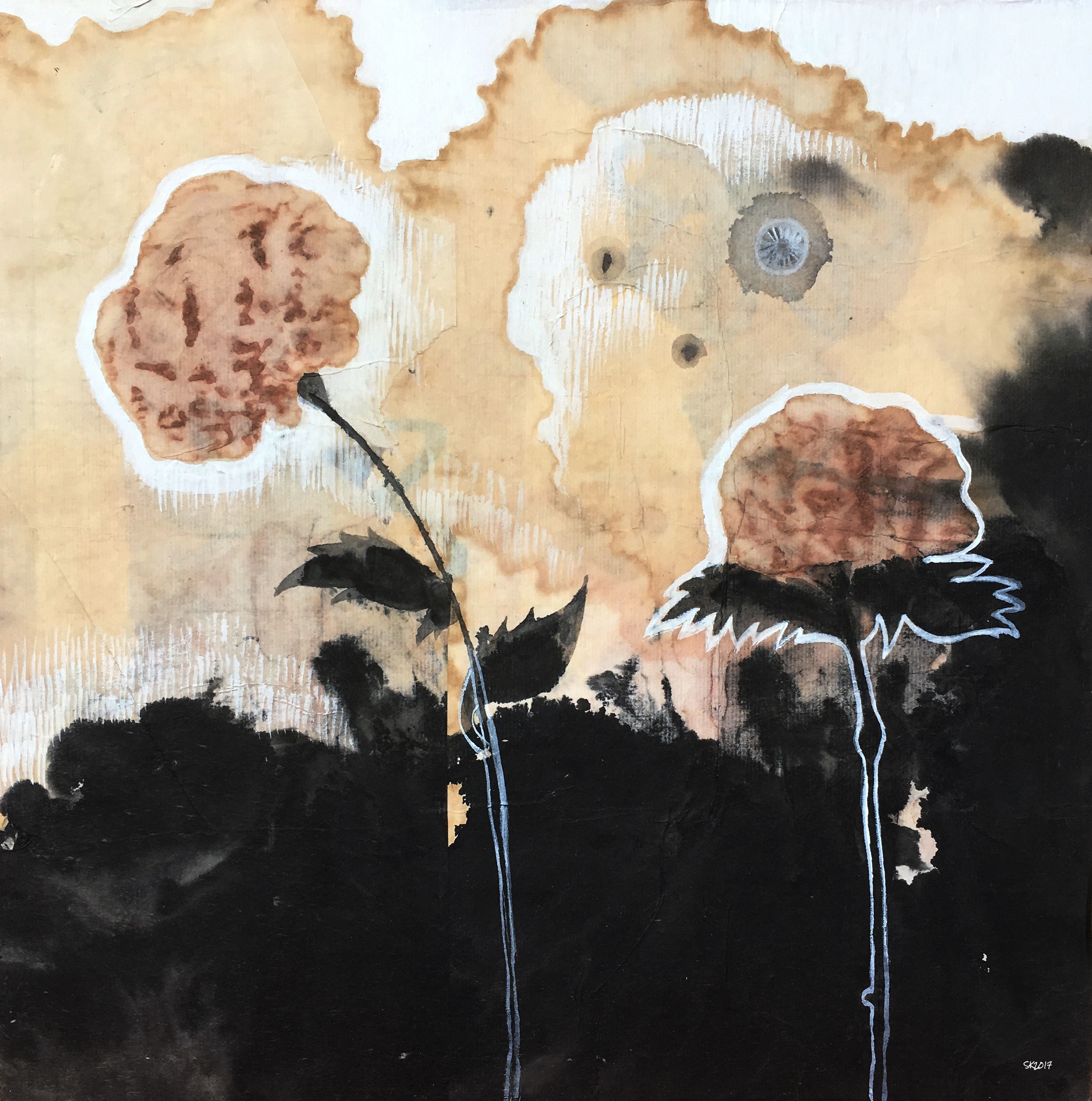 Red wine, coffee, Sumi ink and acrylic on rice paper and wood 2017